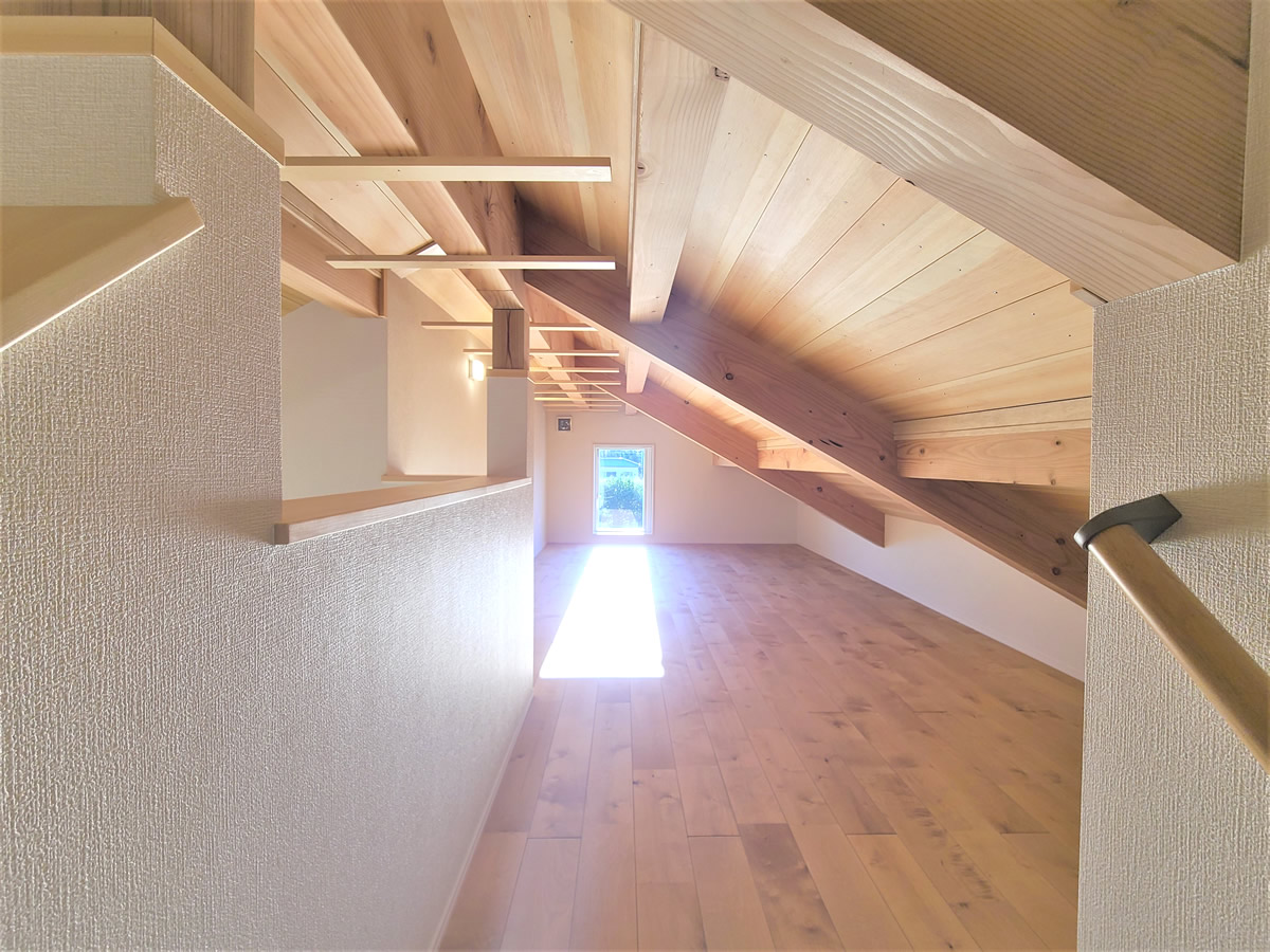 大解放な吹抜けに加え平屋でもしっかりと活用できるロフトを設置。